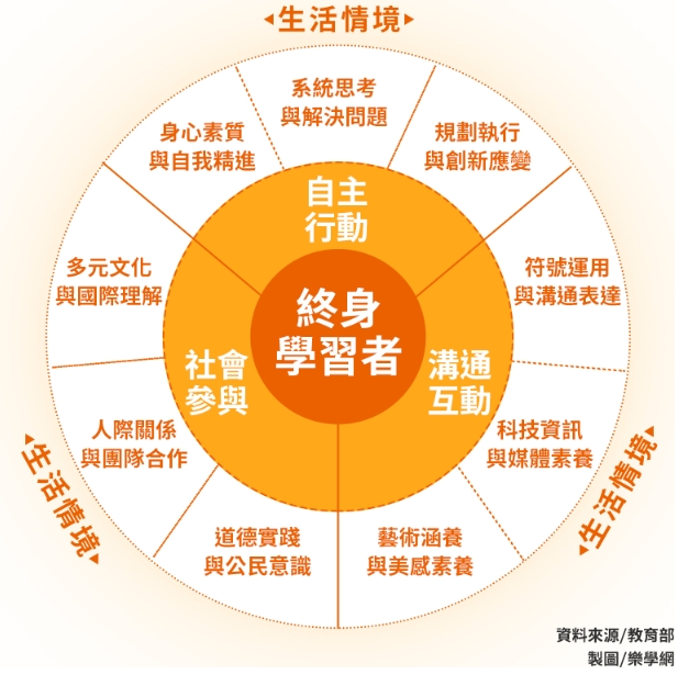 108課綱的DNA:知識+技能+態度指一個人為適應現在生活及面對未來挑戰,所應具備的知識、能力與態度;自108學年度開始,都將加入「核心素養」的學習與命題方式。