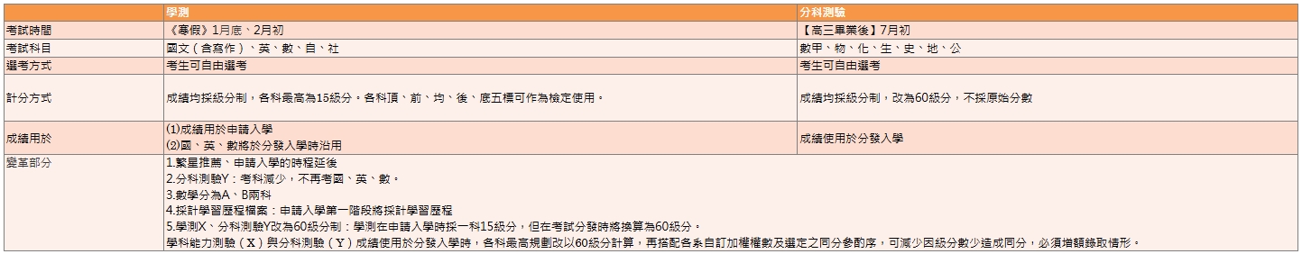 學測(簡稱X)、分科測驗(簡稱Y)、綜合學習表現(簡稱P)。